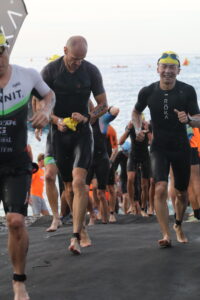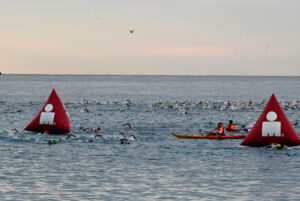 750mのロングレグでは、200mごとのブイを息継ぎ時に確認しつつ、基本はヘッドアップなし。マーク回航のときだけ確認しました。左右の選手の動きや前方の泡を頼りに進み、ほぼ全編でドラフティングに成功。レース後は「寒かった」という声が多かったですが、私は不思議と寒さを感じませんでした。